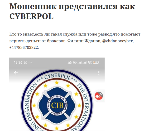 Филипп Жданов представляется сотрудником компании Cyberpol и обещает вернуть деньги, потерянные на проектах скам-брокеров. Стоит ему верить или это очередной скам, расскажем в обзоре.