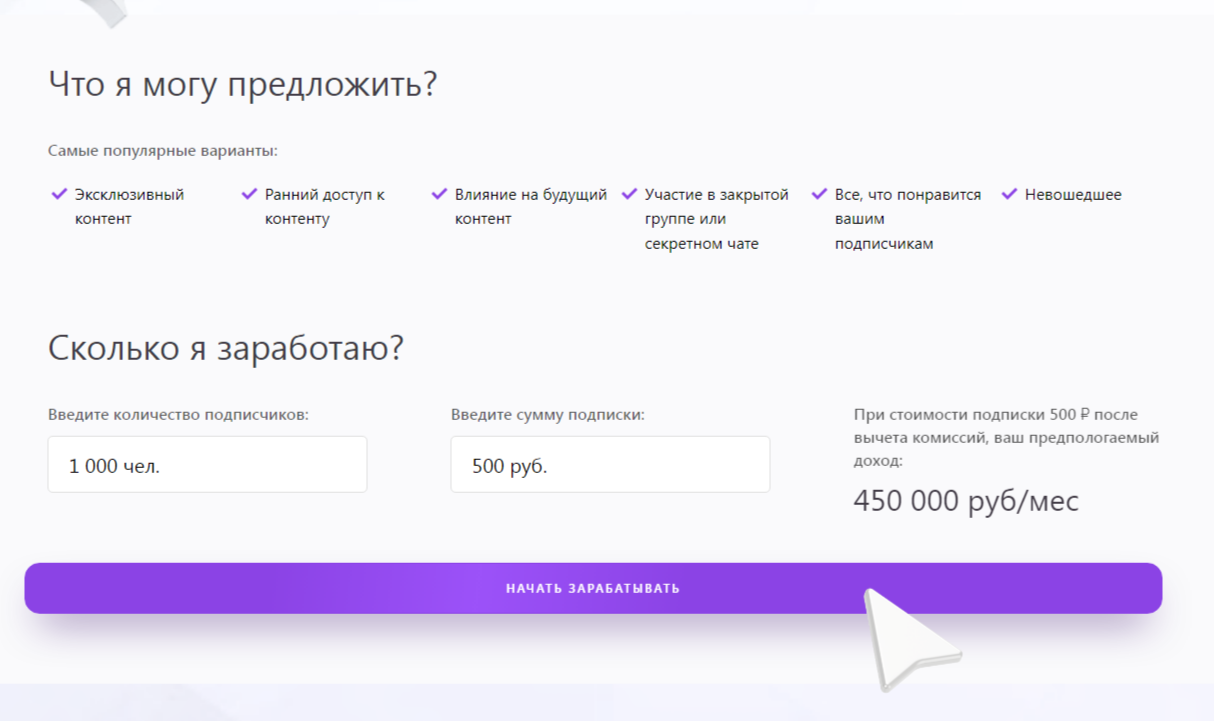 На странице биржи «Пин Пин» расположен калькулятор, который показывает, сколько блогер может заработать. Например, указав количество подписчиков в 1 000 человек и стоимость ежемесячной подписки в 500 рублей, в месяц пользователь будет получать 450 000 тысяч рублей. Эта сумма идет уже с вычетом комиссии, которую нужно будет отдавать площадке.