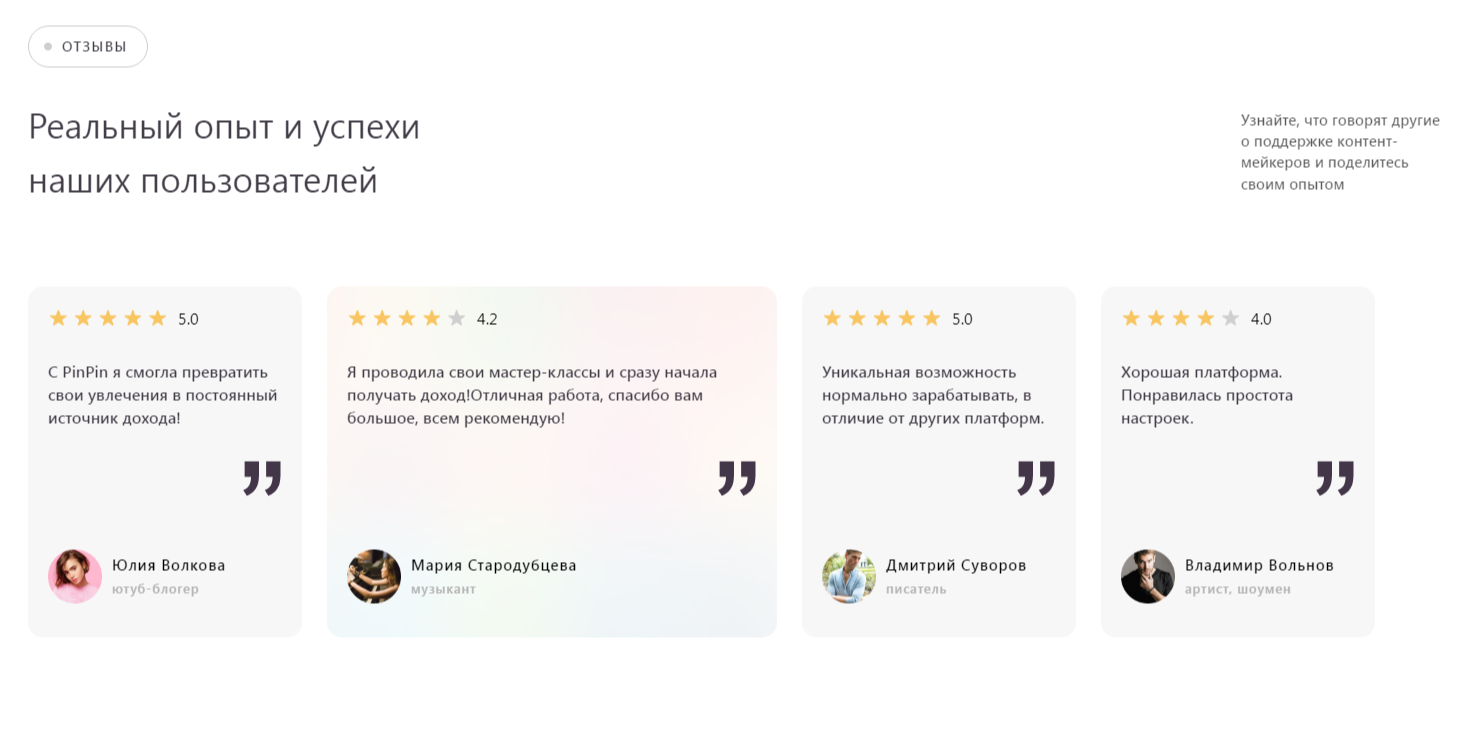 Проект Pinpin отзывы в сети не имеет. Он позиционируется как сервис для монетизации контента и прочего творчества в социальных сетях. Авторы заявляют, что с ними сотрудничают уже тысячи авторов, которые получают высокий заработок.
