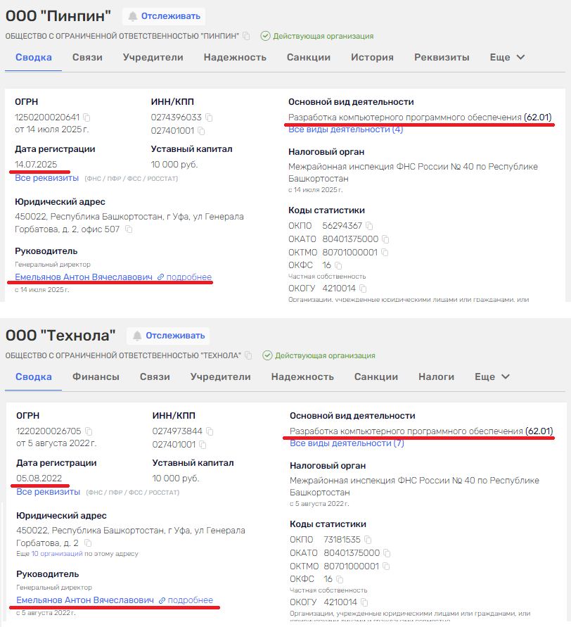 Они сейчас функционируют, причем руководит ими один и тот же человек. Плюс, копмании зарегстрованны по одному и тому же юридическом даресу в Уфе и имеют идентичный основной вид деятельности. Только «ПинПин» работает с 14 июля 2025 года, а «Технола» – с августа 2022 года.
