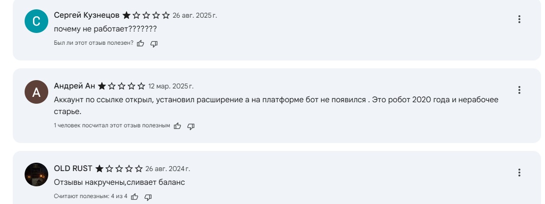 На независимых платформах, в частности, в магазине Хром, мнение разделилось. Одни пользователи уверяют что бот торгует очень успешно и удобен в настройках и управлении.