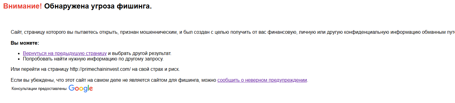 Но при заходе на сайт primechaininvest com. Браузер выдаст предупреждение. Система безопасности заблокирует путь. Платформа в базах мошеннических ресурсов.У проекта есть двойник – lerokixmon com. Дизайн копия. Разница лишь в названии и домене. Классика обмана. Создатели штампуют клоны, обходя блокировку.