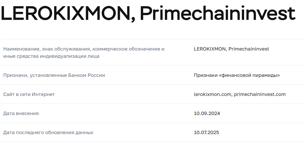 10 сентября 2024 года регулятор ЦБ РФ занес проект в черный список. Официально primechaininvest и lerokixmon признаны мошенническими схемами. Красный флаг для всех.