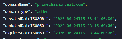 Домен primechaininvest com создан 24 июня 2025 года. Ему всего 4 месяца. Молодые площадки в финансах – повод насторожиться. Особенно если обещают легкий заработок.