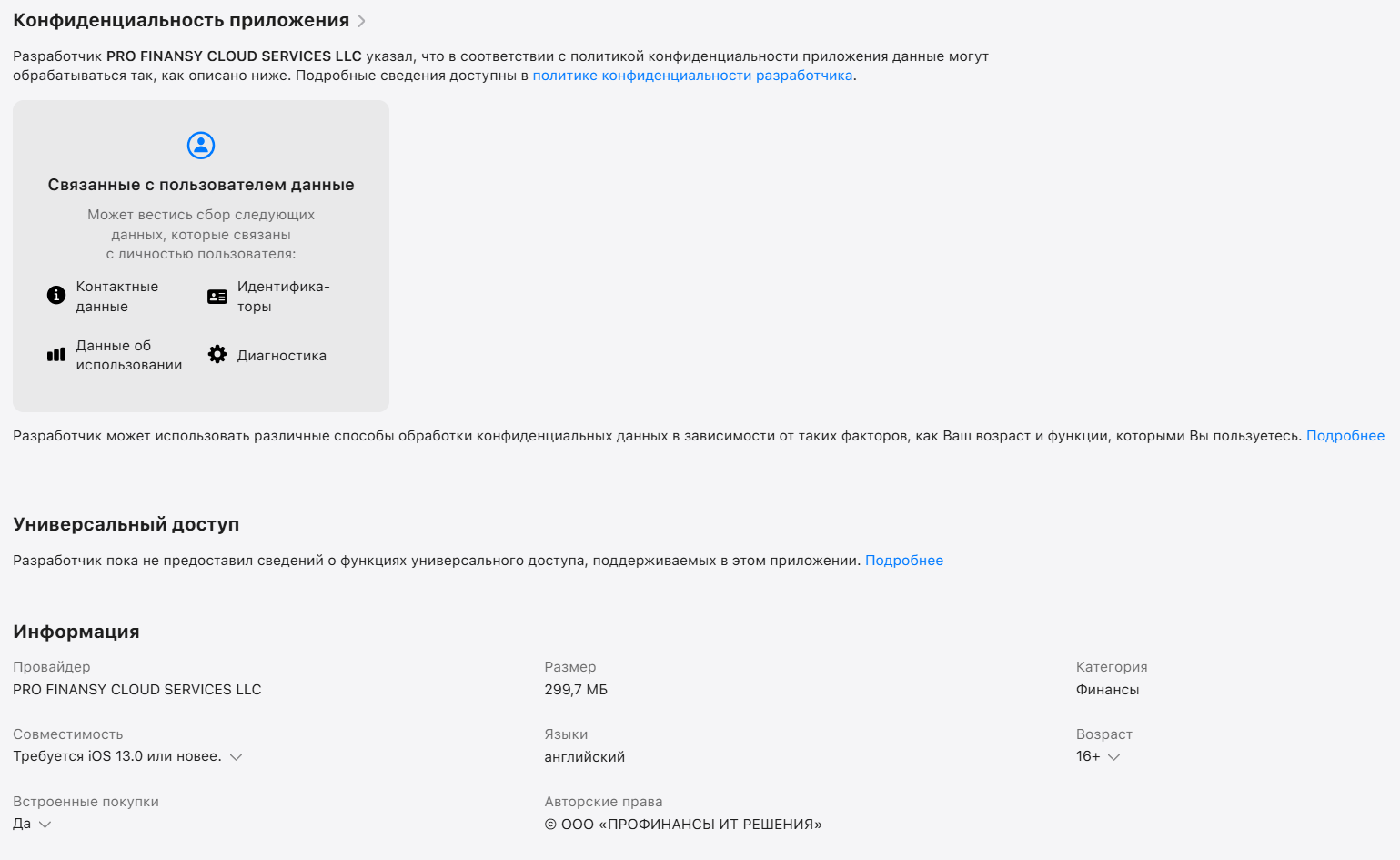 Дата первой публикации приложения в RuStore – конец ноября 2023 года. Однако сама организация существует с июля 2022 года. Домен profinansy ru зарегистрирован 29 июня 2022 года через регистратора на физическое лицо, которое скрыто через сервис приватности.
