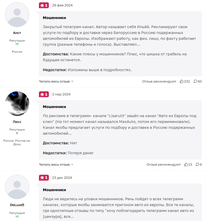 Положительных отзывов на услуги автопригона от ProfAuto на сентябрь 2025 года нет и, судя по текущей репутации проекта, вряд ли появятся. Больше вероятен такой исход событий, как закрытие телеграмм-канала из-за многочисленных жалоб.