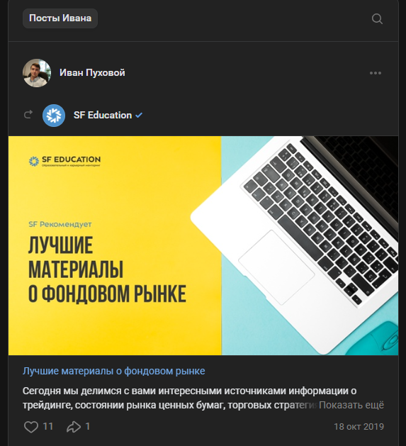 ВКонтакте брокер ведёт личный, не публичный аккаунт, но постит информацию по трейдингу, ориентируясь на сторонние источники – по крайней мере, делал это раньше. Последняя запись оставлена в 2019 году, хотя на октябрь 2025 года сам Иван находится в сети, онлайн.