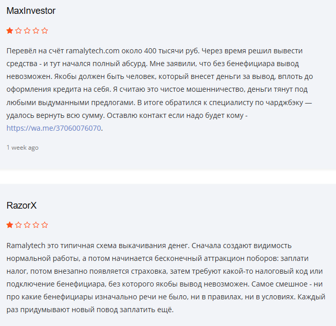 Все отзывы о Ramalytech рассказывают одну историю – бесконечные требования доплат. Сначала просят налог, потом страховку, затем налоговый код. Суммы растут постоянно. Деньги так и не выводятся. Некоторые брали кредиты, чтобы заплатить все сборы и потерять еще больше средств.
