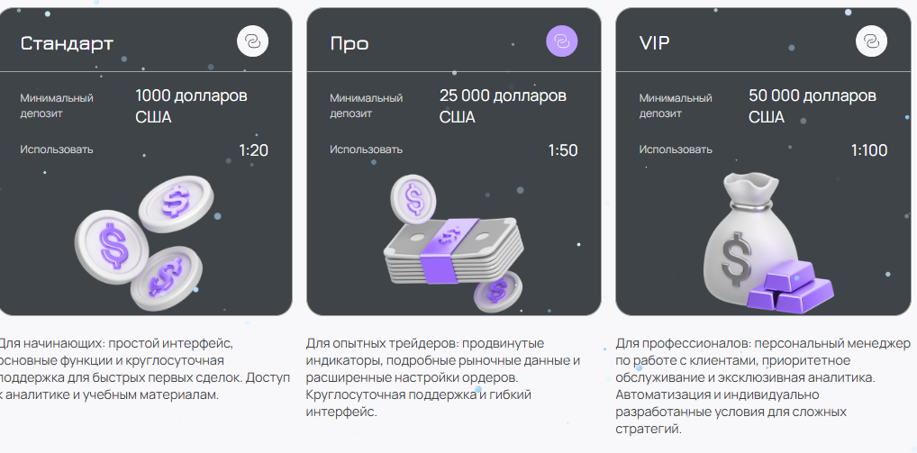 - pro-счет открывается от 25 тысяч долларов, плечо увеличивается до 1:50, клиенты получают расширенные инструменты и детальные данные;