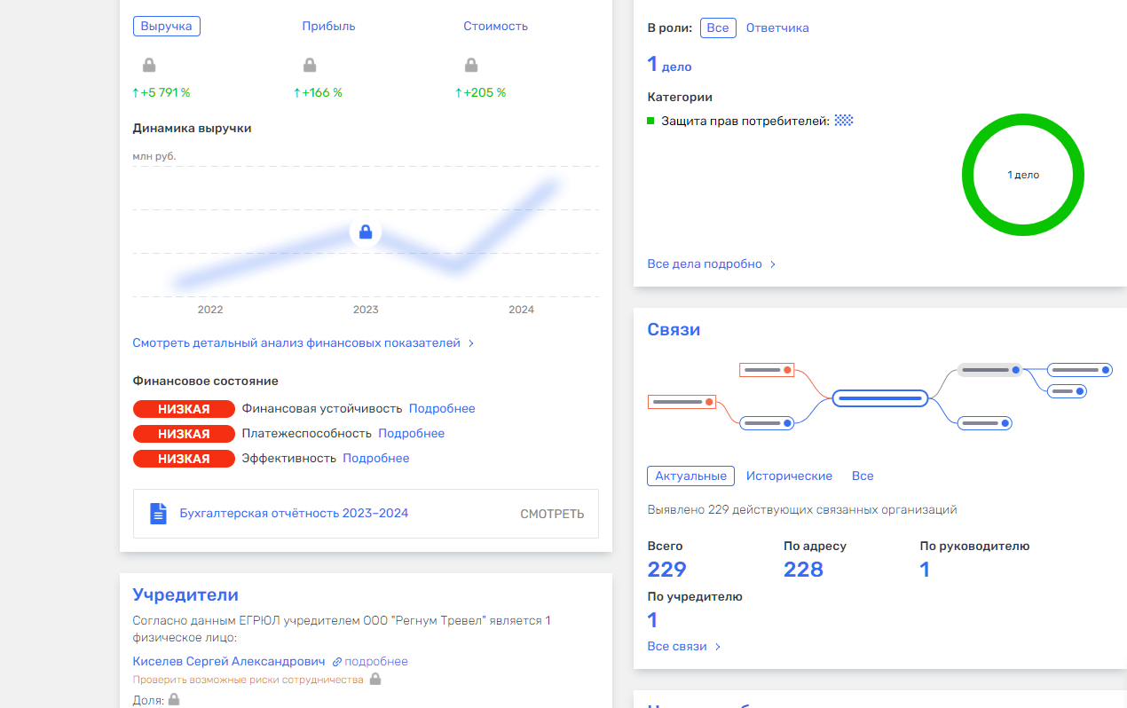 Компания «Регнум» работает с августа 2023 года, имеет офисы в Санкт-Петербурге и в Москве. Официально зарегистрирована как туроператор. Динамика роста прибыли за 2024 год у фирмы неплохая, но финансовая устойчивость, эффективность и платежеспособность организации оцениваются как низкие.
