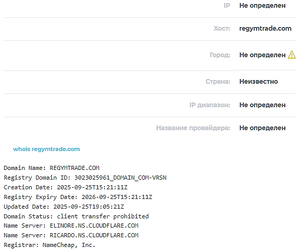 Сайт фирмы RegymTrade открыт 25.09.2025, а регистрация домена в зоне .com оформлена сроком на год. По сервису Whois нельзя определить ни примерное местоположение серверов, ни владельцев ресурса, что уже не позволяет считать валютного брокера надежным.
