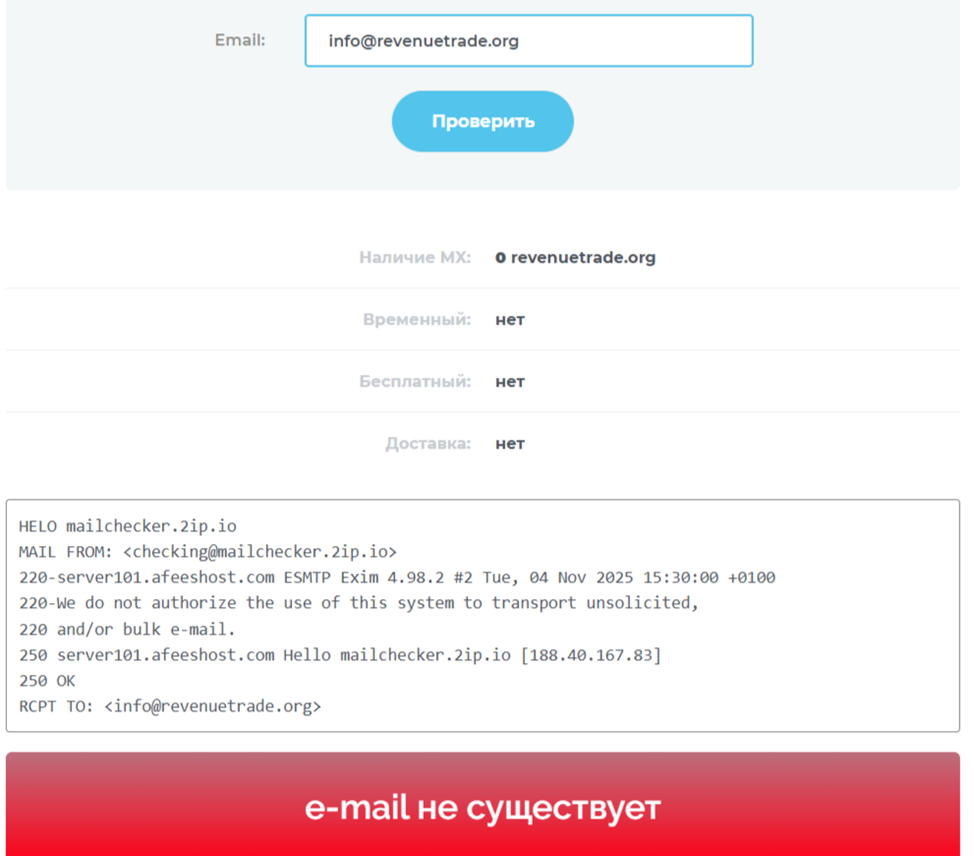 На главной страницы сайта брокера указан контакт – Info revenuetrade org. Мы проверили электронную почту и оказалось, что она несуществующая. Значит, пользователей обманывают и не дают им право на поддержку. Это явный признак мошенничества, который точно нельзя игнорировать, если планируете зарабатывать на финансовых рынках.