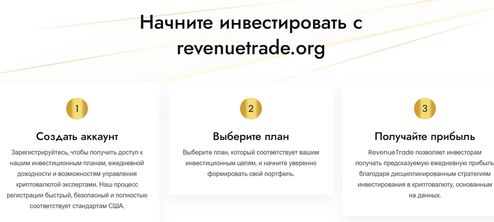 Сайт Revenuetrade Org имеет профессиональный и привлекательный вид. У него удобная навигация и представлены подробности о продуктах и услугах. Пользователям предлагаются различные вкладки, где можно найти необходимую для работы информацию. А если все понятно, нужно пройти регистрацию и выбрать план, чтобы потом получать прибыль. Именно так просто написано на самом сайте.