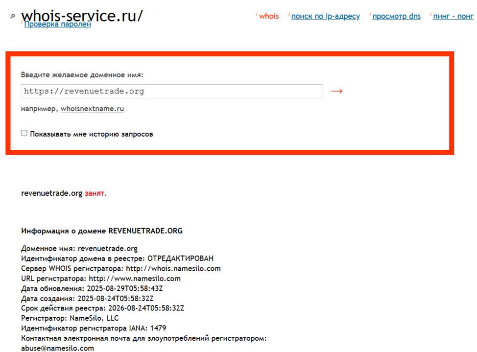 На сайте Revenue Trade найдена информация о длительной работе брокера. Якобы он имеет большой опыт, поэтому ему можно доверять. Но в реальности оказалось, что домен зарегистрирован в августе 2025 года. При таком сроке работы брокер не может называть себя опытным. Проверка показала, что доменный адрес продлен на год. Получается, что сервис планирует заниматься обманной деятельностью и дальше.