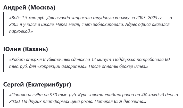 Схема работы напоминает типичный сценарий сомнительных брокеров и идет по шагам. Сначала клиенту дают демо‑счет. На нем «стратегии» показывают красивую доходность за счет подкрученной статистики. Это создает иллюзию, что система реально зарабатывает. Дальше просят внести деньги и переходить на реальный счет. Тут всплывают ограничения на вывод, о которых раньше не говорили. Заявки тянут, условия меняют на ходу.На финальной стадии начинают манипулировать котировками и отчетами, объясняя «убытки» и удержания. Параллельно требуют новые платежи, «налоги», «комиссии за обработку», «выполнение условий бонуса». Такая поэтапная схема – классический признак мошеннического брокера, чья цель максимальное изъятие средств у клиентов.