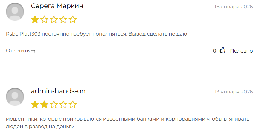 На данный момент о брокере Rsbc platt303 com отзывы появились, несмотря на короткий срок существования. Люди пишут о проблемах с выводом, постоянными требованиями пополнения. Получить деньги после ввода в систему оказывается невозможно. Сейчас проблемы дополняются нестабильным доступом к сайту. Практически все отзывы о «Рсбк Платт303» говорят о негативном опыте работы с площадкой.
