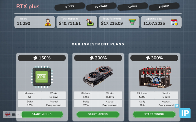 Есть 3 тарифных плана с депозитами от 1, от 250 и от 500 долларов. Прибыль компания обещает соответственно 150% за 10 дней, 200% за 8 и 300% за 6. Во-первых, при волатильности рынка такие заработки на трейдинге невероятны. Во-вторых, такие условия не выгодны самой организации. А это подсказывает, что перед нами мошенничество.Обзор официального сайта Rtxplus