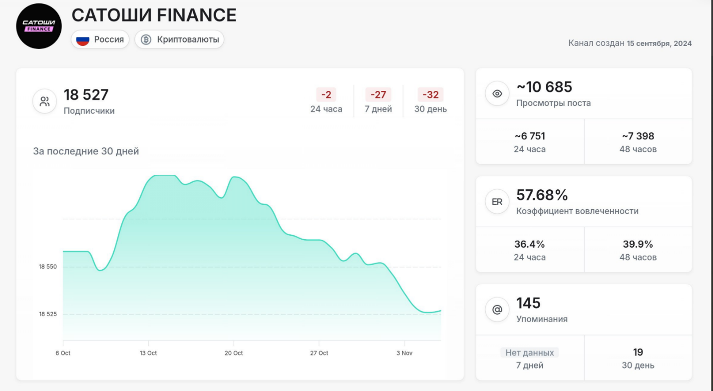 На ТГ канал «САТОШИ FINANCE» якобы подписано 18 527 человек. Но статистика ТГ показывает, что активность в этом ТГ канале низкая. Накрутка трафика была выполнена в феврале 2025 года. Сейчас проект посещает не больше трех пользователей в день.