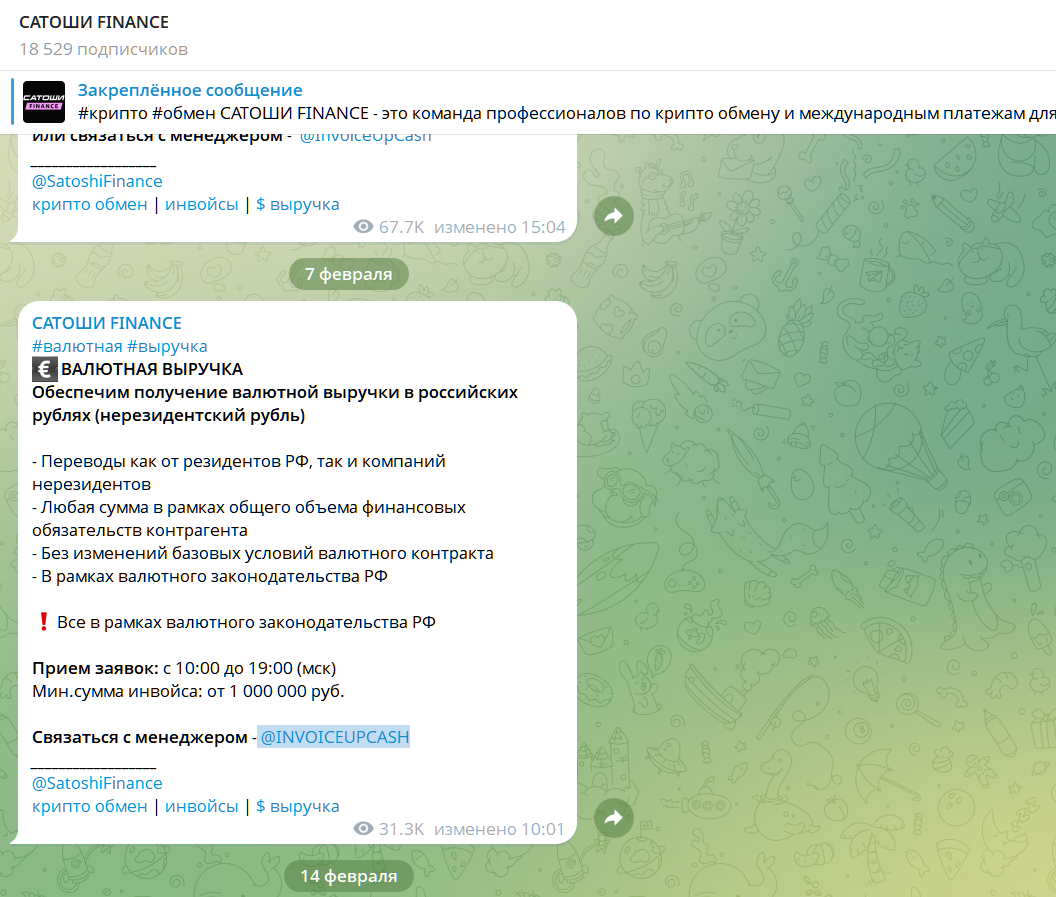 Криминальный серый обменник SatoshiEx предлагает поменять наличные на крипту, оплатить товары в других странах по инвойсам, получить валютную выручку на рублевые счета в РФ. В связи с санкционными ограничениями появляется все больше серых финансовых схем взаиморасчетов между физическими и юридическими лицами.