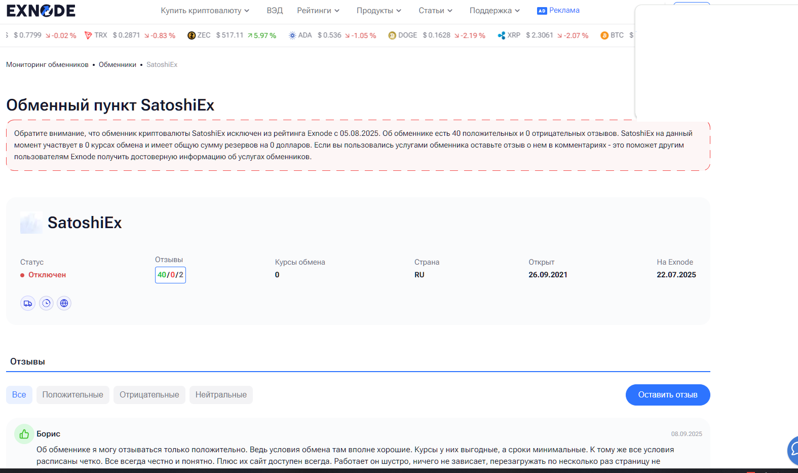 Отзывы про этот обменник на сайте Exnode были положительные. Пользователи сообщали, что сайт не зависал, обмен проводили быстро и без проблем. Но есть нюанс, обменник исключили из рейтинга в августе 2025 года.