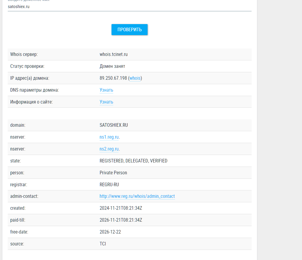 Домен сайта был зарегистрирован в ноябре 2024 года частным лицом. Никакой информации о разрешении на финансовую деятельность, технической поддержке сервиса не предоставлено.