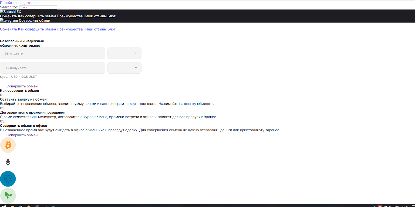 Сайт SatoshiEx Ru «солидной» финансовой компании выглядит странно. Казалось бы, фирма, которая оперирует такими оборотами средств, может создать нормальный сайт с рабочим функционалом. Но клиентам предлагают сайт, сделанный школьником, без html разметки, со странным дизайном.