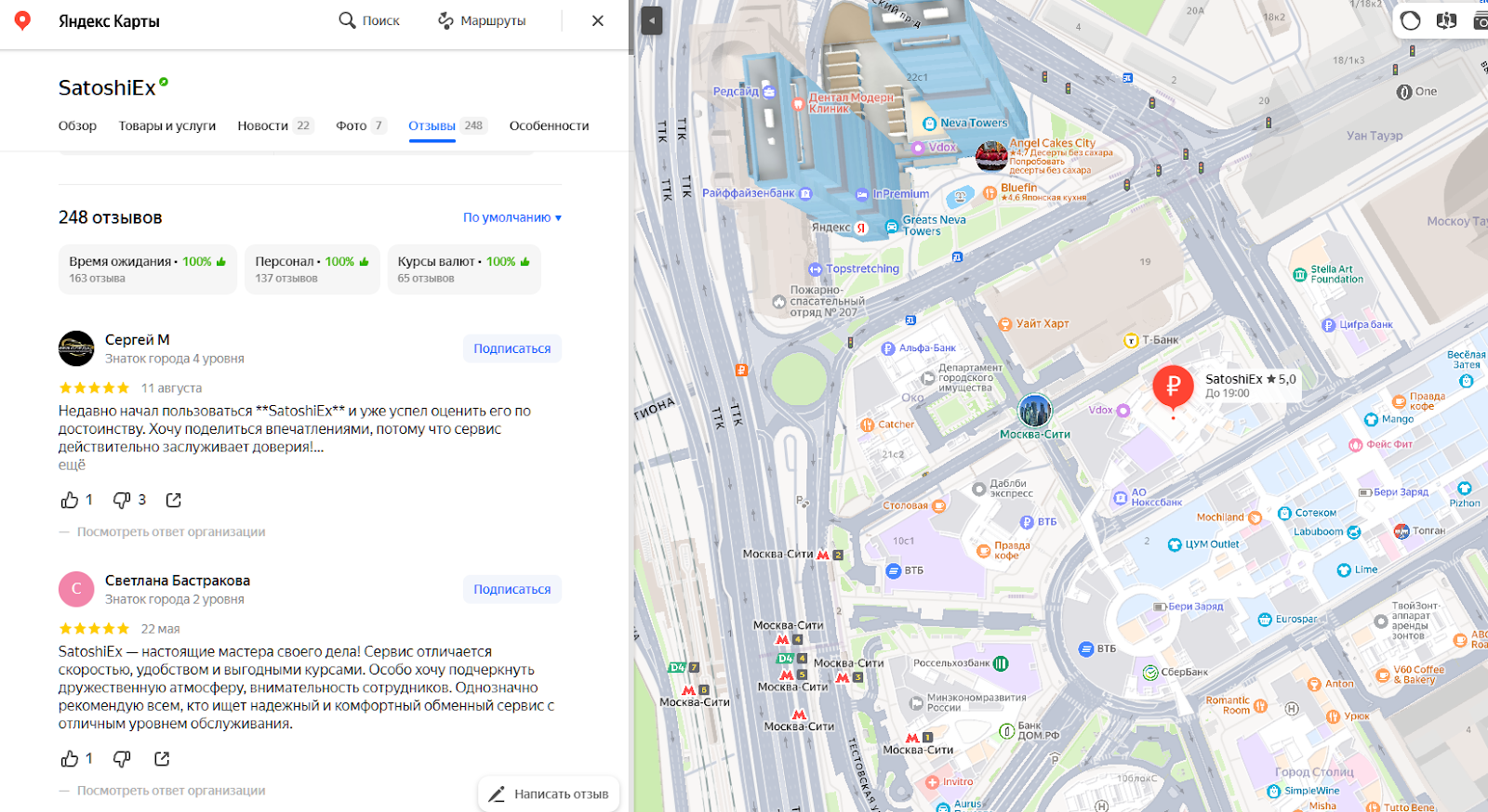 Положительные отзывы на «Яндекс картах» про этот обменник датированы августом 2025 года. Больше хороших комментариев про этот сервис написано не было. Проверить, написаны отзывы ботами или реальными людьми сложно. Но тексты комментов шаблонные, такие «причесанные» отзывы в реальности про обменники крипты редко встречаются.