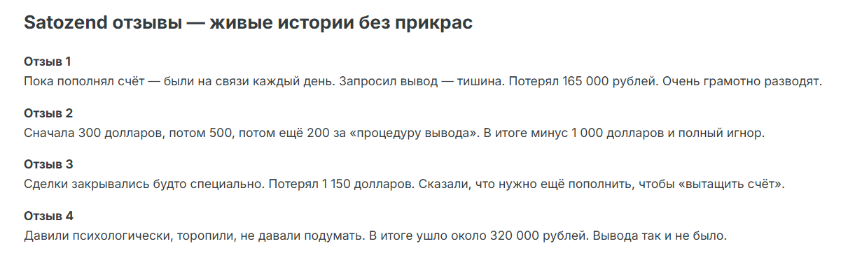 - отзывы о «Сатозенд» в основном негативные – сотрудничество приводит к убыткам.