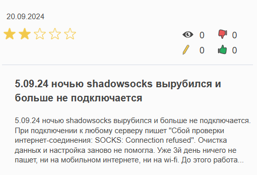 В сети можно найти не так много отзывов от клиентов проекта Shadowsocks Vpn в Telegram, некоторые пишут о том, что vpn может внезапно выключиться и больше не подключается, а после не работает еще несколько дней.