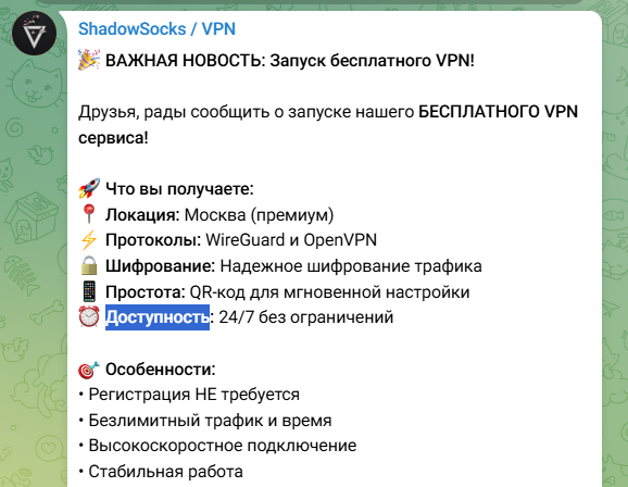 Проект не предлагает у себя на основном канале никаких платных услуг, единственное, что доступно на канале это vpn от Shadow Socks в Телеграмм, но как сообщается он доступен бесплатно. Клиенту не требуется регистрироваться, а сам vpn доступен круглосуточно, трафик в нем безлимитный, а подключение якобы высокоскоростное. Все, что требуется от пользователя это использовать qr-код для настройки подключения.