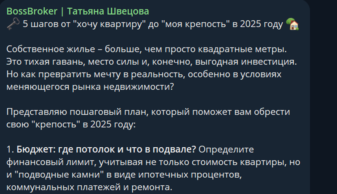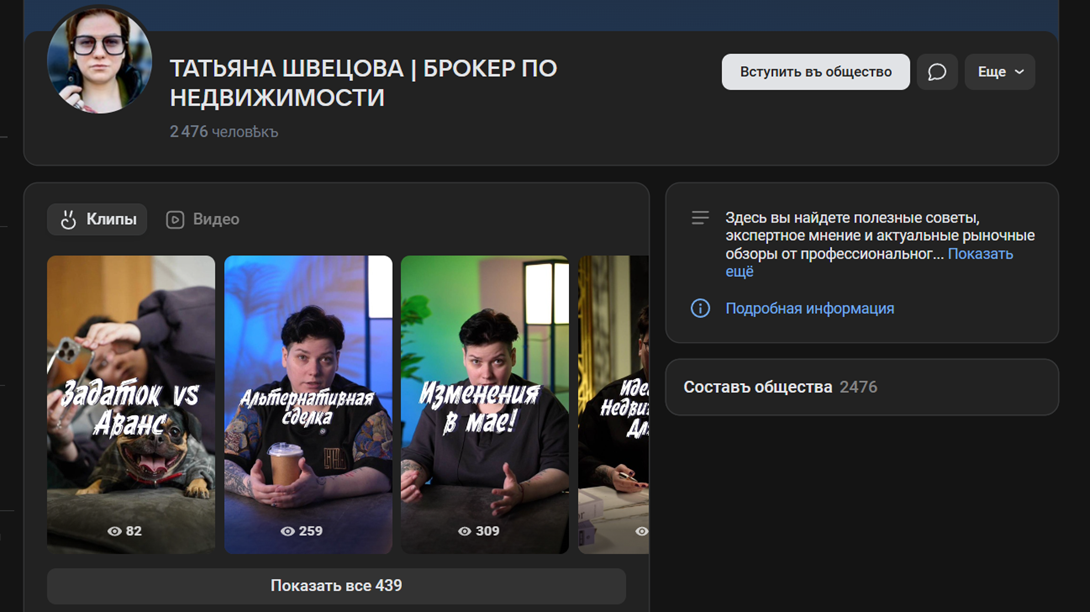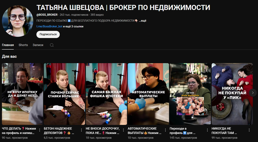 Швецова Татьяна Витальевна в последнее время делает посты, которые посвящены общей теме недвижимости. Она рассказывает об ипотеке, принципах ценообразования, актуальном положении рынка недвижимости в стране и раскрывает прочие темы. При этом коммерческие предложения для подписчиков сохраняются, но появляются не очень часто.
