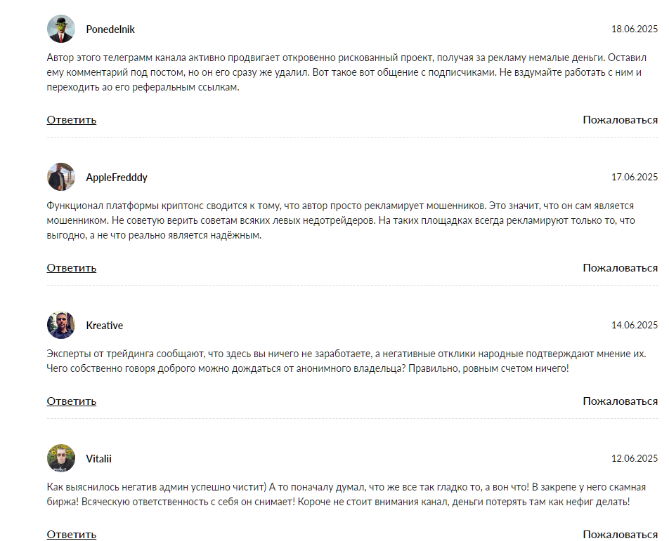 Отзывы о заработке с ТГ каналами «Криптонс», «Сидим в минусе»
