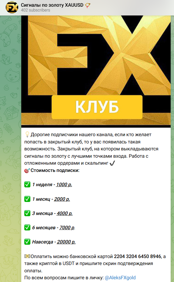 Оплатить подписку можно банковской картой или перевести крипту Usdt Алексу, а после прислать скрин подтверждения оплаты. По всем вопросам об оплате и подписке нужно писать Алексу в его личный телеграмм-канал.Обзор социальных сетей AleksFXgold