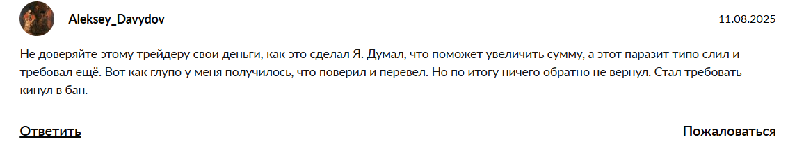 В интернете не так много комментариев и отзывов о телеграм-канале «Xauusd Сигналы по золоту». Пользователи пишут о том, что доверять свои деньги Алексу не стоит, поскольку это приведет к убыткам, автор сливает депозиты подписчиков и требует перевести еще.