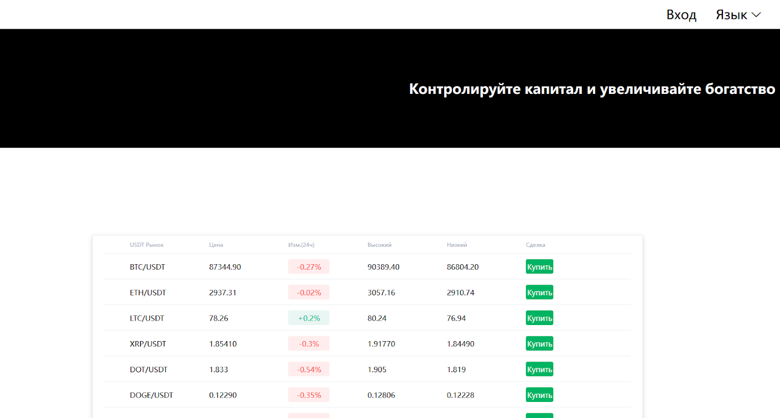 Ввод-вывод на сайте осуществляется через USDT, официальные платежные системы не подключены. А среди доступных токенов для торгов: