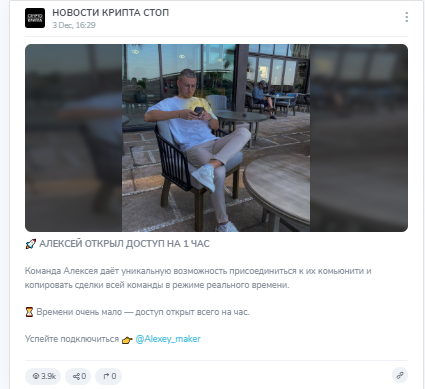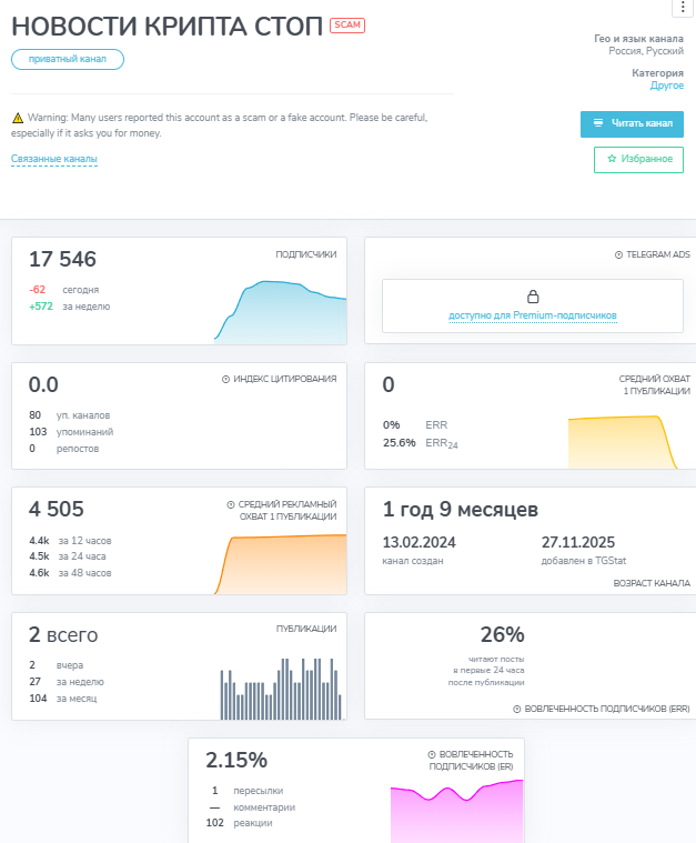 Трейдер говорит об успешном управлении инвестициями, но доказательств этому нет, а также непонятно сколько стоят его платные услуги. Хоть канал создан 13.02.2024, статистика показывает резкий прирост подписчиков только в ноябре 2025 года, причем видно, что почти все посты были удалены, название изменилось на «Новости Крипта Стоп», а рядом добавлена надпись scam.