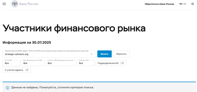 На сайте Strategic Advisers Org фирма заявляет, что деятельность биржи лицензирована компанией FCA, номер лицензии 401805. Мы проверили фирму в сервисе Центрального Банка России. Выяснилось, что у организации нет необходимого разрешения для работы на территории РФ.