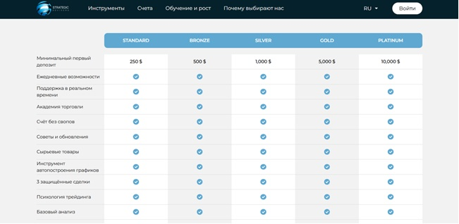 Компания Strategic Advisers предусмотрела для своих клиентов широкий выбор счетов для работы. Все они различаются первым минимальным депозитом и функционалом. Всего брокер выделил 5 видов счетов: