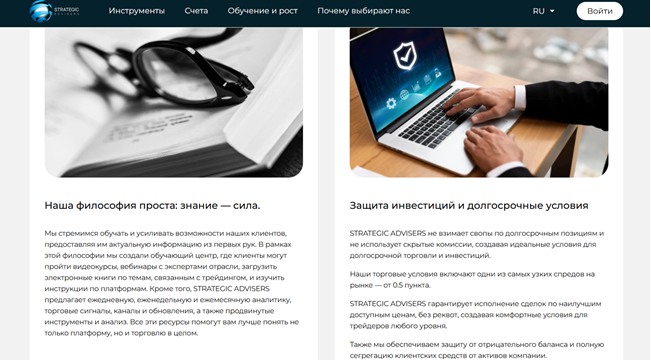 Владельцы биржи Strategic Advisers Org заявляют, что являются ведущей брокерской фирмой. Компания регулярно отслеживает тренды инвест-сферы и добавляет актуальные инструменты. Кроме того, на площадках Strategic Advisers, согласно отзывам, брокер размещает образовательные материалы.