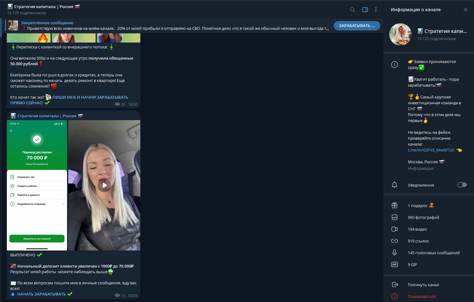 Попасть в канал можно только по пригласительной ссылке. Сразу бросается в глаза контент, который якобы должен привлекать внимание: «Заявки принимаются СРАЗУ», «Хватит работать — пора зарабатывать!», «Не ведитесь на фейки — только мы настоящие». По факту это не маркетинг — старые приемы, которые приелись аудитории, давно работающей в интернете.