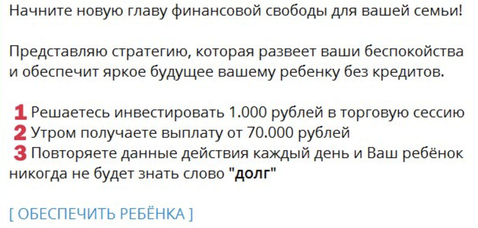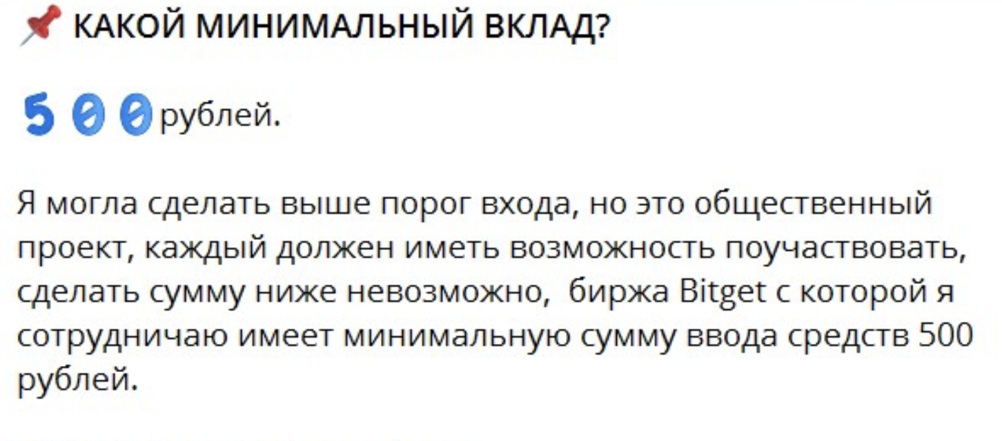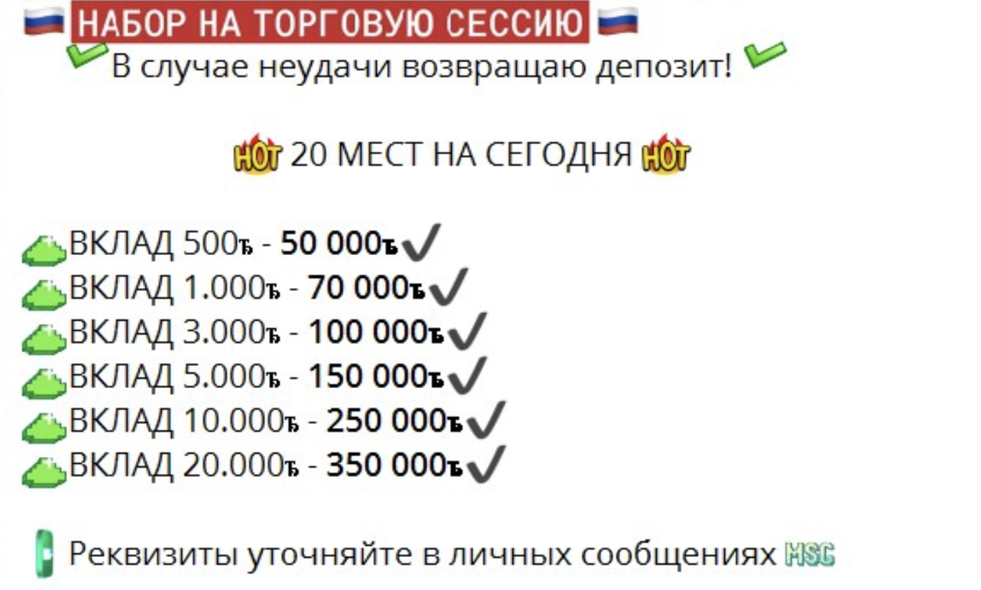 Обещания трейдерши реалистичными не назовешь: доход в 50 тысяч рублей при депозите в 500 рублей выглядят сказочными. При вкладе от 20 тысяч рублей Стрельцова вовсе обещает раскрутить депозит до 350 тысяч. Количество торговых мест на ее «сессии» ограничено, что характерно для каждого сомнительного телеграм-проекта.