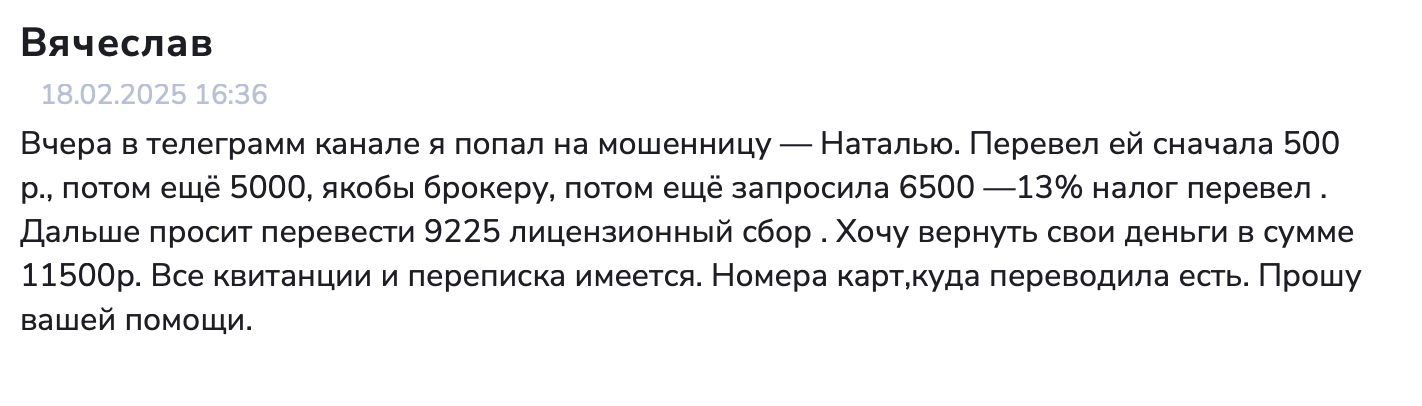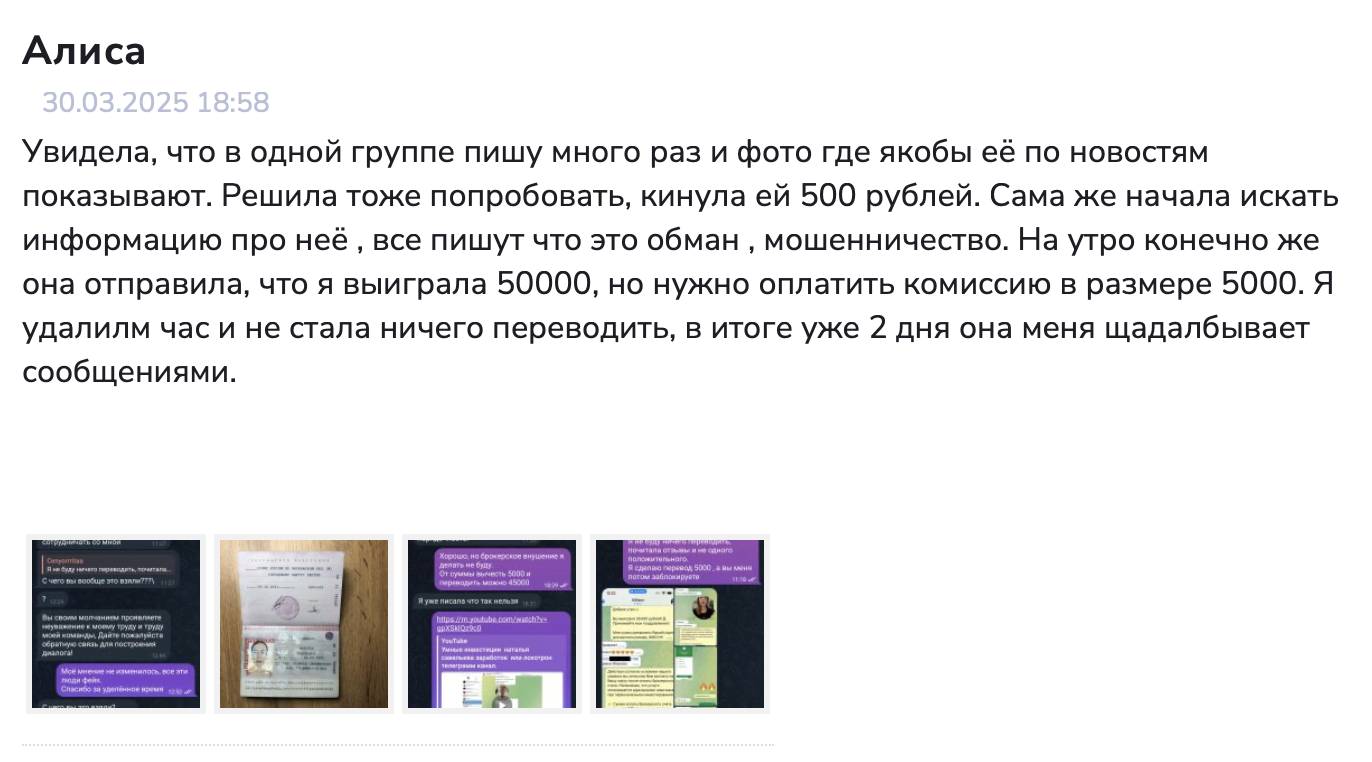 Впрочем, ни одна из найденных нами Стрельцовых не имеет ОКВЭД и лицензию на оказание финансовых, брокерских и смежных услуг. С учетом того, что Наталья осуществляет деятельность строго через телеграм, рассчитывать на наличие у нее лицензии слишком наивно. Репутация мошенницы бежит впереди самой Натальи и делает углубленную проверку ее личности почти бессмысленной.