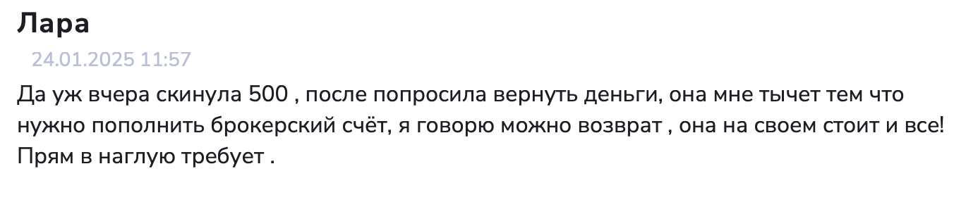 Говоря про независимую оценку проекта «Деньги нашим», отзывы телеграмм канал получает только негативные. Схема развода в исполнении Стрельцовой подробно расписана в многочисленных разоблачениях и комментариях пострадавших. Механика обмана всегда одна: жертва вносит депозит, получает скриншоты с «плюсами на счетах», но в итоге остается ни с чем.