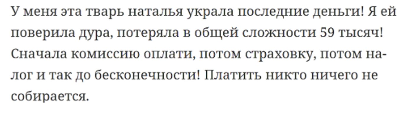 Когда жертва отказывается вносить дополнительные платежи, Наталья пытается давить психологически. Если ее тактика не работает, она просто блокирует клиента и присваивает себе внесенный депозит.