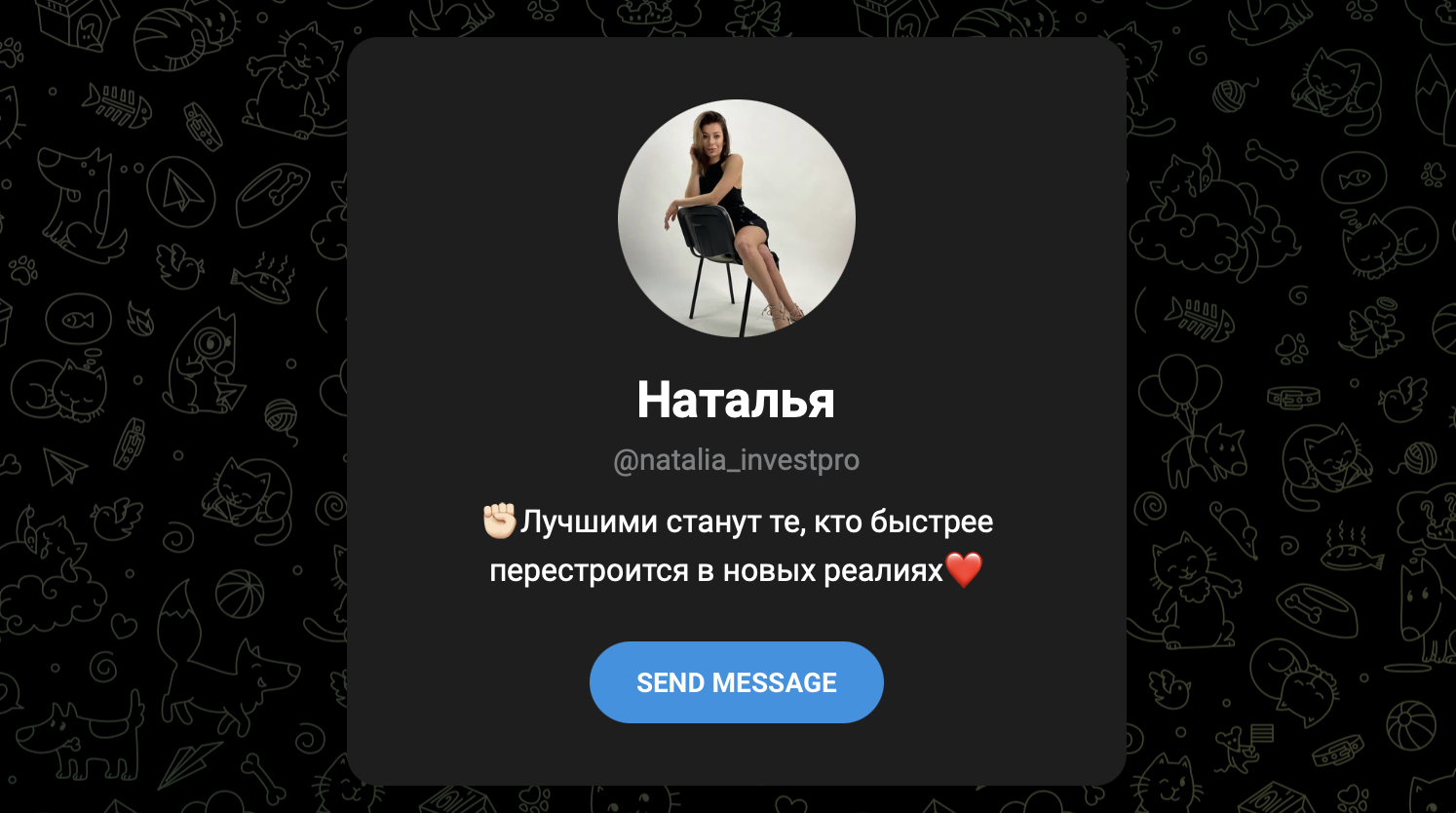 В социальных сетях мошенница представлена очень широко. На ее счету многочисленные телеграм-сообщества с похожим содержанием. В их числе бот nataliainvestmoney bot и канал natalia investpro.