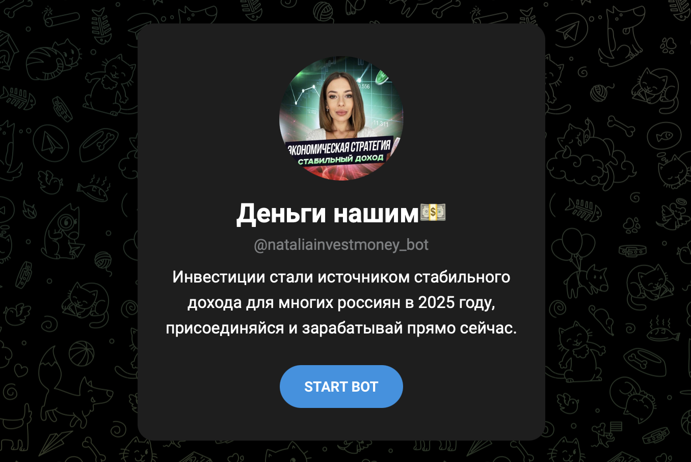 В своих социальных сетях Наталья играет роль добродетеля и обещает научить секретам быстрого заработка на инвестициях каждого желающего. Познать все тонкости успешного криптовалютного арбитража она предлагает в рамках трейдинг-сессий. Для этого нужно всего лишь воспользоваться телеграм-ботом, подключив к нему кошелек и внеся стартовый депозит.