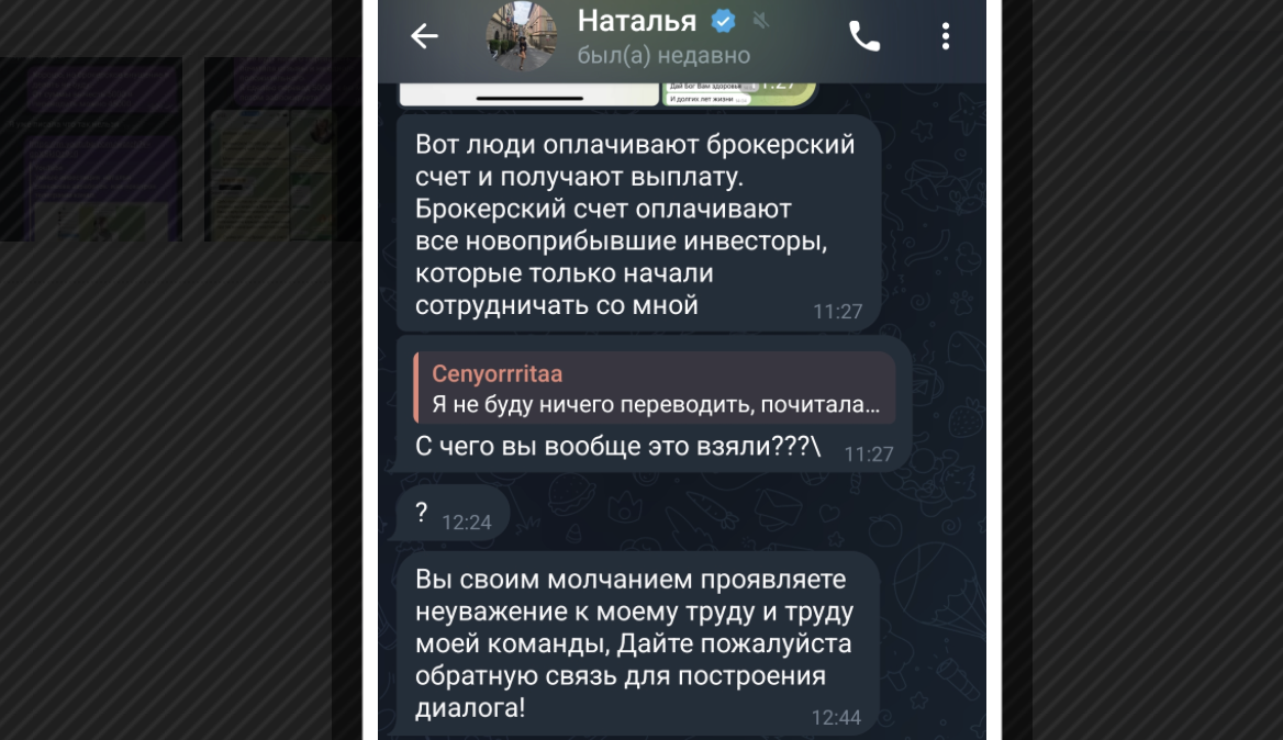 Мошенница поначалу поддерживает с клиентом связь, отправляя ему скриншоты «успешной торговли», чтобы усыпить его бдительность. Когда доверчивый клиент пытается получить собственные деньги, Наталья сообщает ему о дополнительных платежах и комиссиях. Одна из любимых отговорок Стрельцовой – необходимость оплаты загадочного «брокерского счета».
