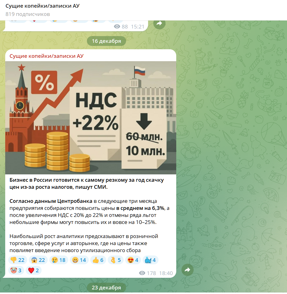 Обзор информации в ТГ канале «Сущие копейки записки АУ»