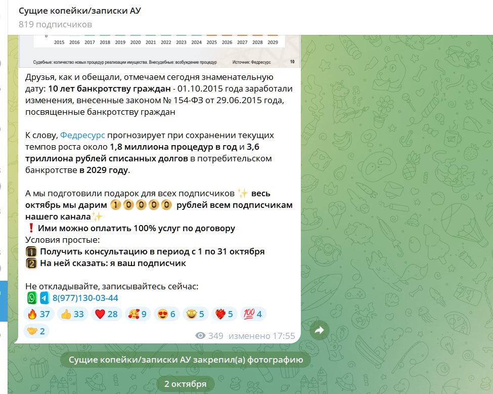Проект в ТГ создан для рекламы работы бюро банкротства физических лиц и привлечения клиентов. В ТГ канале не публикуется открыто реклама компании, не указаны расценки на консультации, юридическое обслуживание.