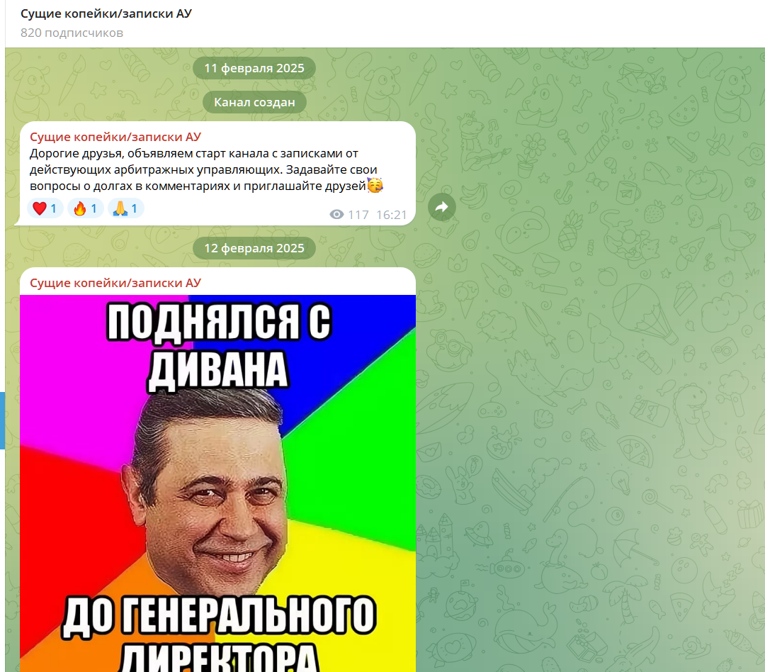 ТГ канал компании «Сущие копейки записки АУ» зарегистрирован в феврале 2025 года, насчитывает 825 подписок, но активно просматривают посты и оставляют реакции не более 100 пользователей.